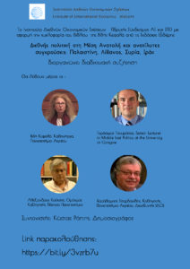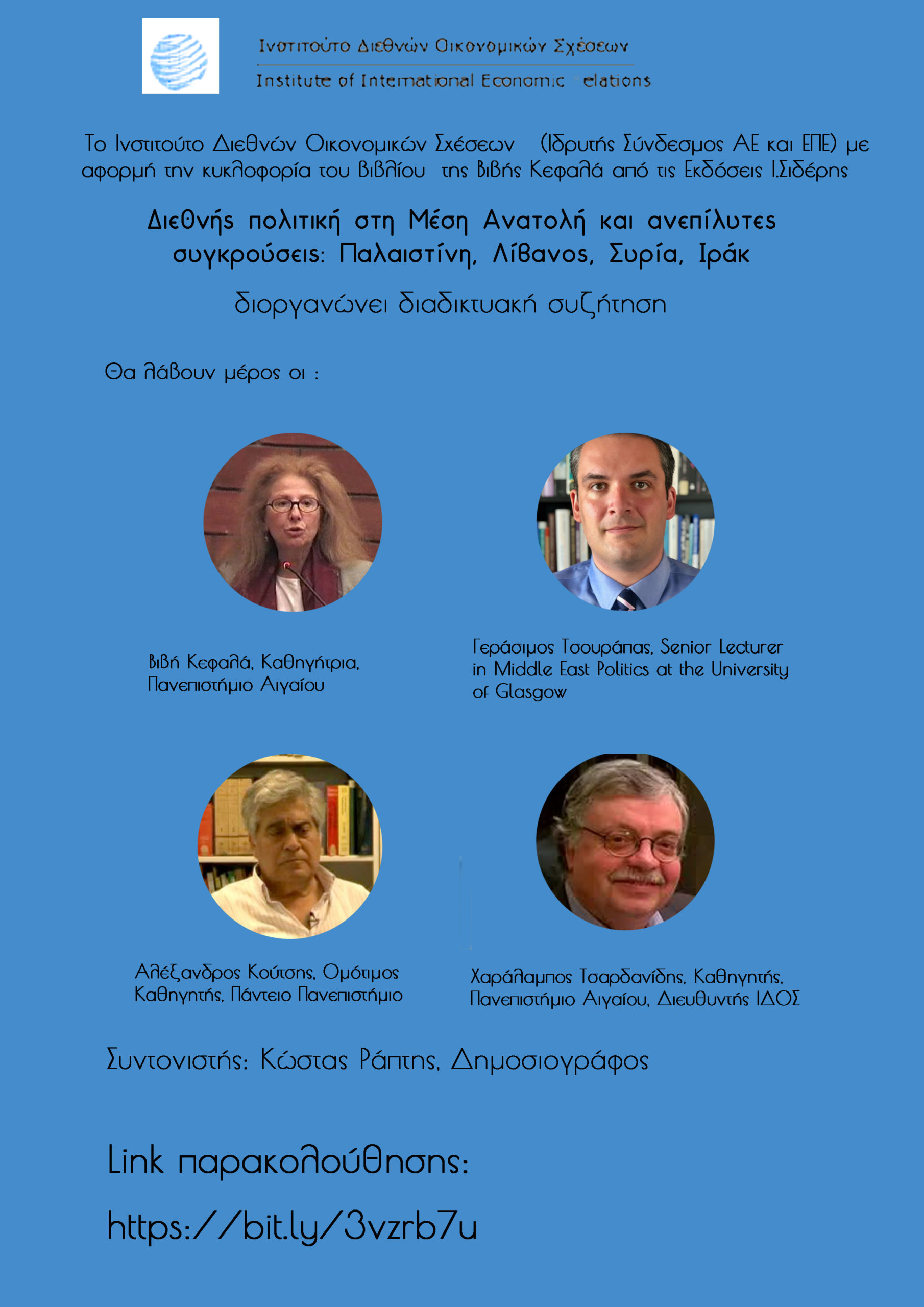 Διαδικτυακή Συζήτηση: Οι διεθνείς εξελίξεις στη Μέση Ανατολή 18 Ιουνίου 2021 Τα νέα μας, Εκδηλώσεις Το Ινστιτούτο Διεθνών Οικονομικών Σχέσεων διοργανώνει διαδικτυακή συζήτηση με θέμα : Οι διεθνείς εξελίξεις στη Μέση Ανατολή στις την Τρίτη, 29 Ιουνίου 2021 και ώρα 7:00 μμ Πρόσκληση Μέση Ανατολή 29.6.2021