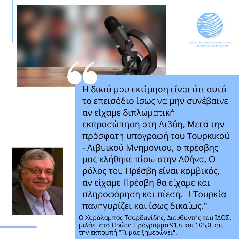 Συνέντευξη του κου Χαράλαμπου Τσαρδανίδη στο Πρώτο Πρόγραμμα της #ΕΡΤ 19 Νοεμβρίου 2022 Εκδόσεις O Διευθυντής του #ΙΔΟΣ, Χαράλαμπος Τσαρδανίδης, μιλάει στη Νεφέλη Λυγερού στο Πρώτο Πρόγραμμα της #ΕΡΤ για την πρόσφατη επίσκεψη του Υπουργού Εξωτερικών Νίκου Δένδια, ανέλυσε το διπλωματικό επεισόδιο Αθήνας – Τρίπολης, και τις πιθανές επιπτώσεις. Μπορείτε να ακούσετε τη συνέντευξη ΕΔΩ