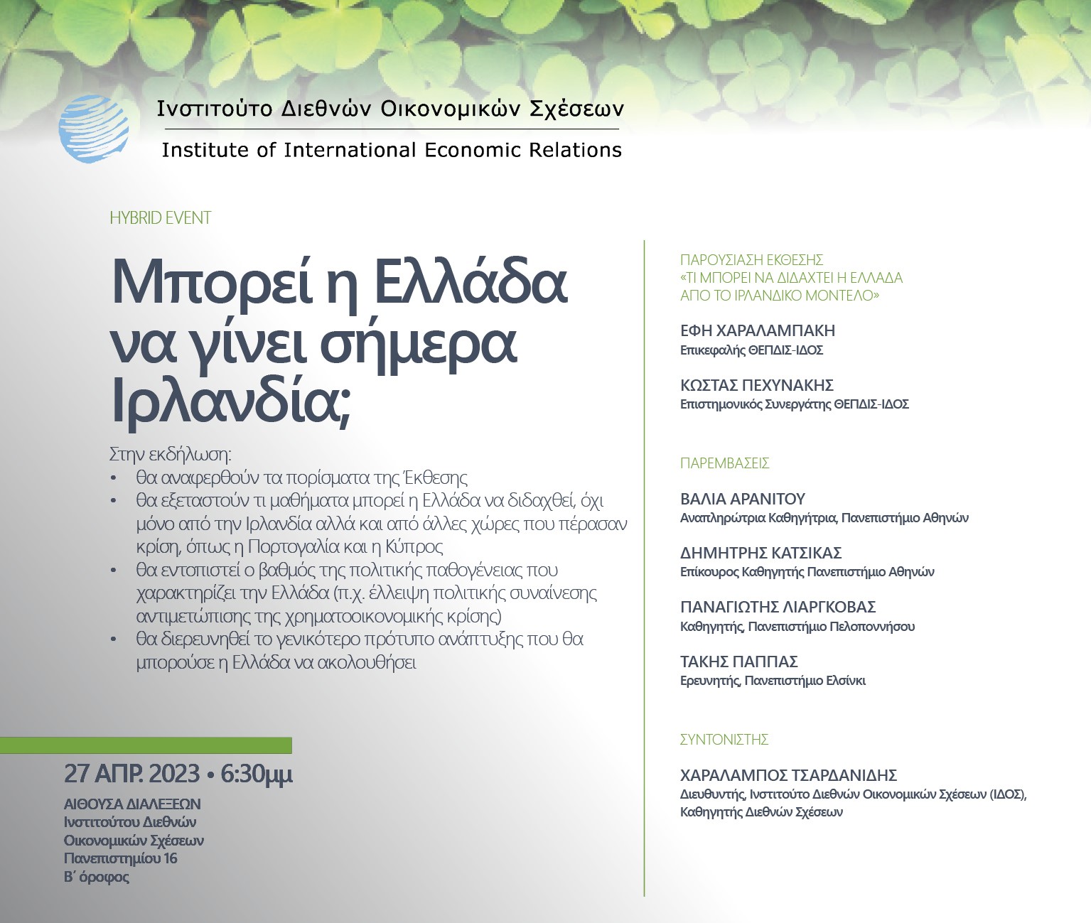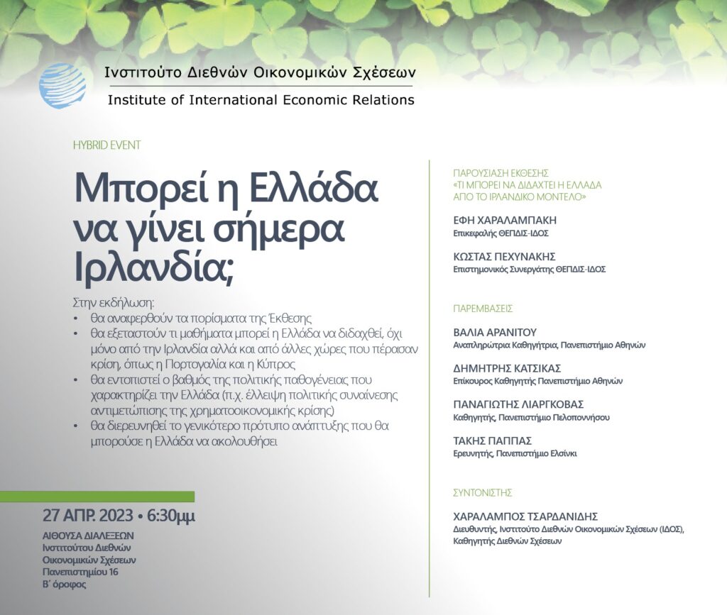 Tο Ινστιτούτο Διεθνών Οικονομικών Σχέσεων (ΙΔΟΣ), που έχει ιδρύσει ο Σύνδεσμος ΑΕ και Επιχειρηματικότητας, με αφορμή την ολοκλήρωση της Έκθεσης «Τι μπορεί να διδαχτεί η Ελλάδα από το Ιρλανδικό μοντέλο» της ερευνητικής ομάδας του προγράμματος Θεωρία και Πράξη των Διεθνών Σχέσεων (ΘΕΠΔΙΣ), διοργανώνει την Πέμπτη 27 Απριλίου 2023 και ώρα 6:30 μμ υβριδική εκδήλωση με θέμα:
