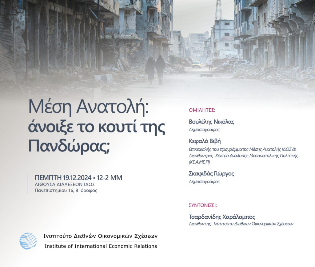 Το Ινστιτούτο Διεθνών Οικονομικών Σχέσεων – ΙΔΟΣ / IIER, με αφορμή τις εξελίξεις στη Συρία και την πτώση του καθεστώτος Άσαντ, διοργάνωσε συζήτηση την Πέμπτη 19 Δεκεβρίου 2024 με θέμα: