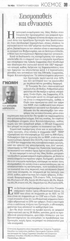 Άρθρο στα ΝΕΑ 17.5.2023 του Αντώνη Δεριζιώτη, Επικεφαλή του Τμήματος Τουρκικών Σπουδών του Ινστιτούτου Διεθνών Οικονομικών Σχέσεων (ΙΔΟΣ) και Λέκτορα, Τμήμα Τουρκικών Σπουδών και Σύγχρονων Ασιατικών Σπουδών (ΤΣΣΑΣ) του ΕΚΠΑ, όπου συμπεραίνεται ότι: