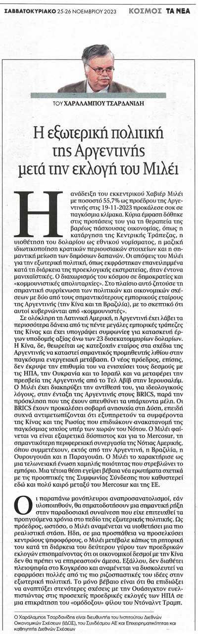 Η ανάδειξη του εκκεντρικού Χαβιέρ Μιλέι με ποσοστό 55.7% ως Πρόεδρου της Αργεντινής στις 19.11.2023 προκάλεσε σοκ σε παγκόσμια κλίμακα.