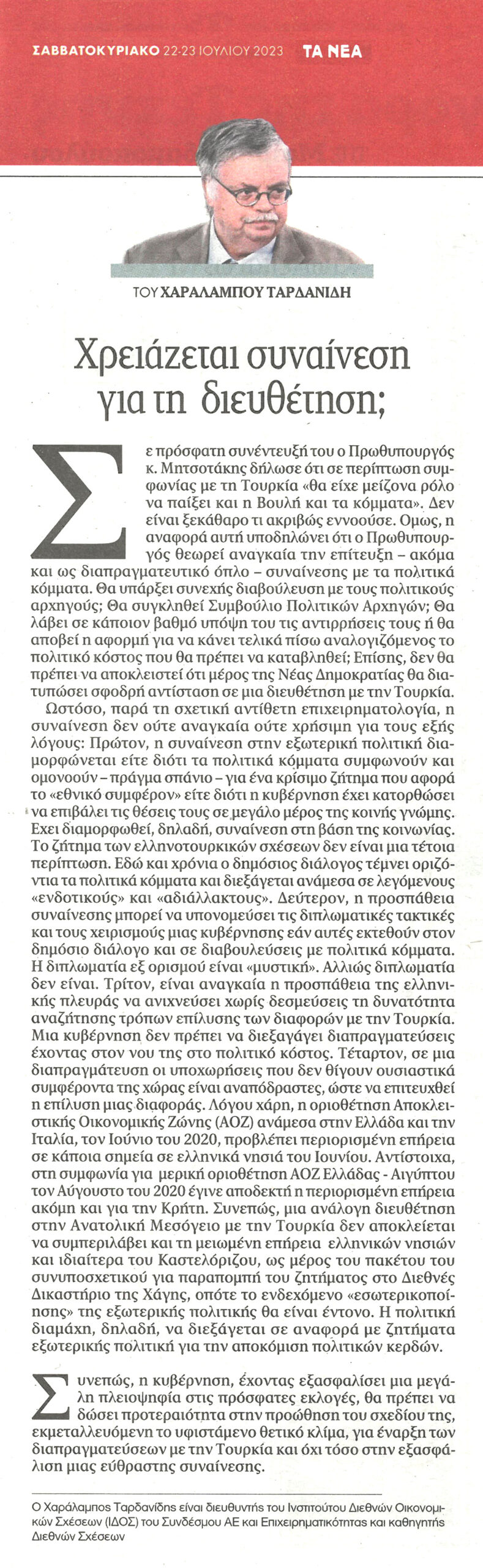 Διατυπώνει την άποψη ότι η κυβέρνηση έχοντας εξασφαλίσει μια μεγάλη πλειοψηφία στις πρόσφατες εκλογές, θα πρέπει να δώσει προτεραιότητα στην προώθηση του σχεδίου της, εκμεταλλευόμενη το υφιστάμενο θετικό κλίμα, για έναρξη διαπραγματεύσεων με την Τουρκία και όχι τόσο στην εξασφάλιση μιας εύθραστης συναίνεσης με τα πολιτικά κόμματα.