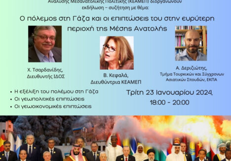 Το Ινστιτούτο Διεθνών Οικονομικών Σχέσεων (ΙΔΟΣ) και Κέντρο Ανάλυσης Μεσανατολικής Πολιτικής (ΚΕΑΜΕΠ) στις 23 Ιανουαρίου 2024 διοργάνωσαν διαδικτυακή εκδήλωση – συζήτηση με θέμα: Ο πόλεμος στην Γάζα και οι επιπτώσεις του στην…