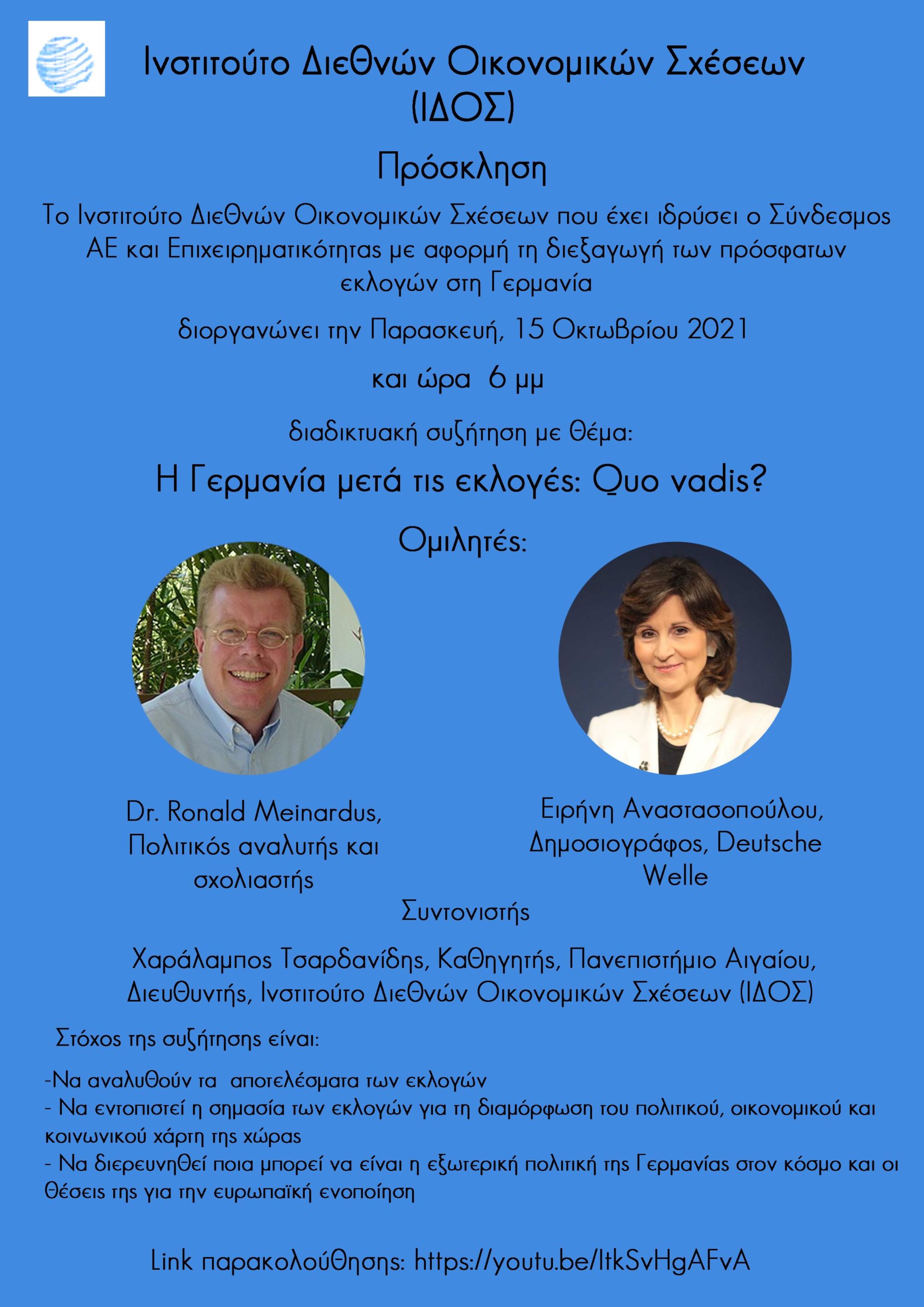 Tο Ινστιτούτο Διεθνών Οικονομικών Σχέσεων που έχει ιδρύσει ο Σύνδεσμος ΑΕ και Επιχειρηματικότητας, με αφορμή τη διεξαγωγή των πρόσφατων εκλογών στη Γερμανία διοργανώνει την