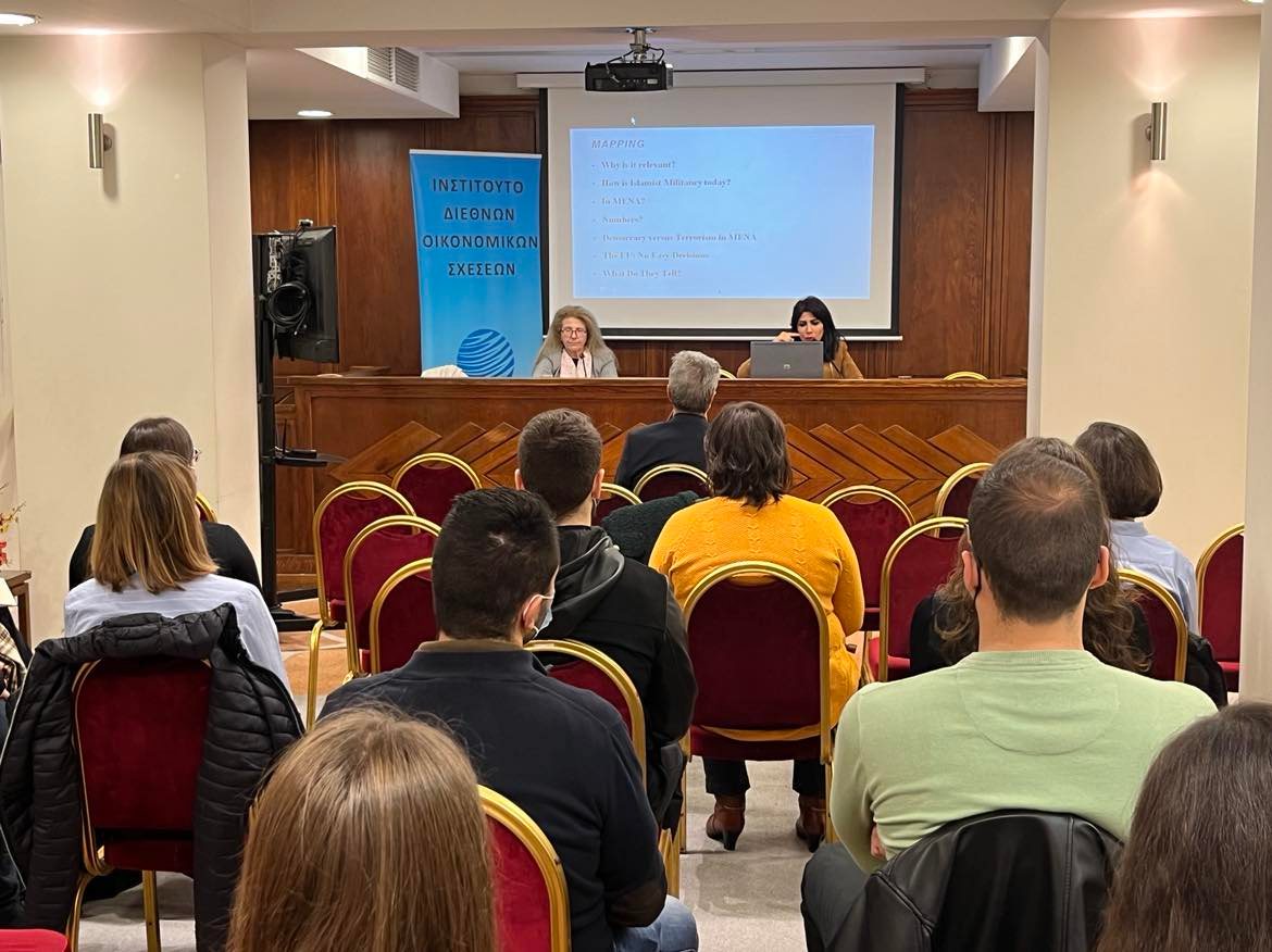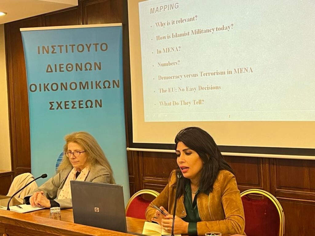 Οn November 21, 2022 at the Institute of International Economic Relations (IDOS), Associate Professor, Department of Political Science, Cairo University, Ebtisam Hussein gave a lecture on “Islamist Militancy in Post- 2011 MENA Region“.