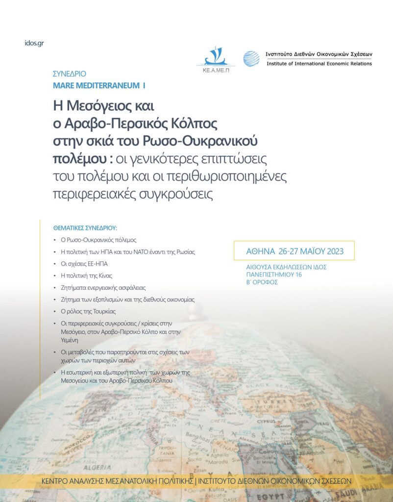 Tο Κέντρο Ανάλυσης Μεσανατολικής Πολιτικής (ΚΕ.Α.ΜΕ.Π) του Ινστιτούτου Διεθνών Οικονομικών Σχέσεων (ΙΔΟΣ) διοργανώνει συνέδριο Mare Mediterraneum Ι με θέμα: “Η Μεσόγειος και ο αραβο–περσικός Κόλπος στη σκιά του ρωσο-ουκρανικού πολέμου: οι γενικότερες επιπτώσεις του πολέμου και οι περιθωριοποιημένες περιφερειακές συγκρούσεις”