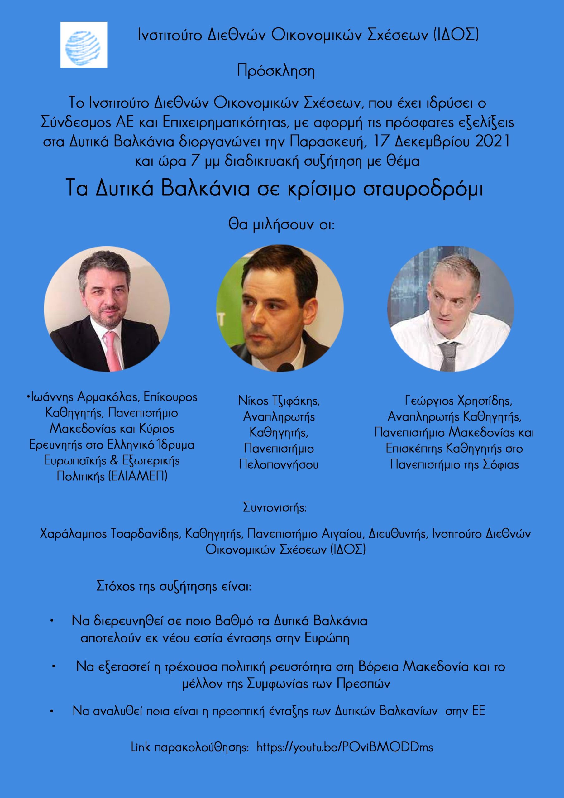 Tο Ινστιτούτο Διεθνών Οικονομικών Σχέσεων, που έχει ιδρύσει ο Σύνδεσμος ΑΕ και Επιχειρηματικότητας, με αφορμή τις πρόσφατες εξελίξεις στα Δυτικά Βαλκάνια διοργανώνει την
