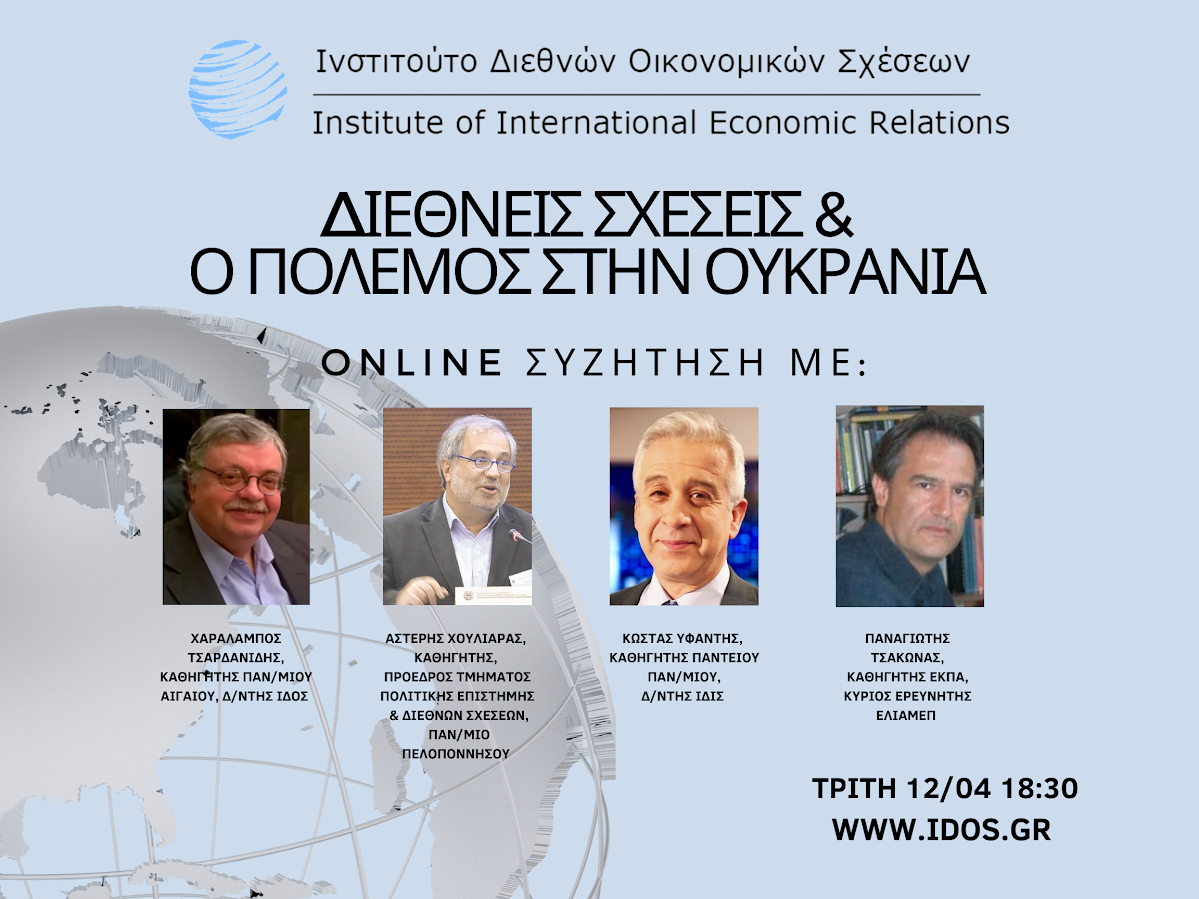 Το Ινστιτούτο Διεθνών Οικονομικών Σχέσεων (ΙΔΟΣ), που έχει ιδρύσει ο Σύνδεσμος ΑΕ και Επιχειρηματικότητας, διοργάνωσε την Τρίτη, 12 Απριλίου 2022, διαδικτυακή συζήτηση με θέμα: Διεθνείς Σχέσεις και ο πόλεμος στην Ουκρανία.