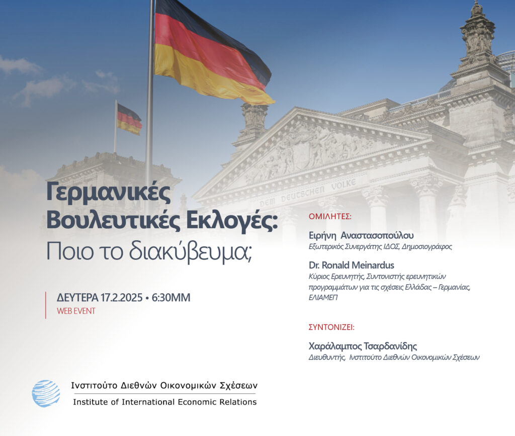 Tο Ινστιτούτο Διεθνών Οικονομικών Σχέσεων (ΙΔΟΣ), που έχει ιδρύσει ο Σύνδεσμος ΑΕ και Επιχειρηματικότητας, σας προσκαλεί σε διαδικτυακή εκδήλωση τη Δευτέρα, 17 Φεβρουαρίου 2025 και ώρα 6:30 μμ με θέμα: